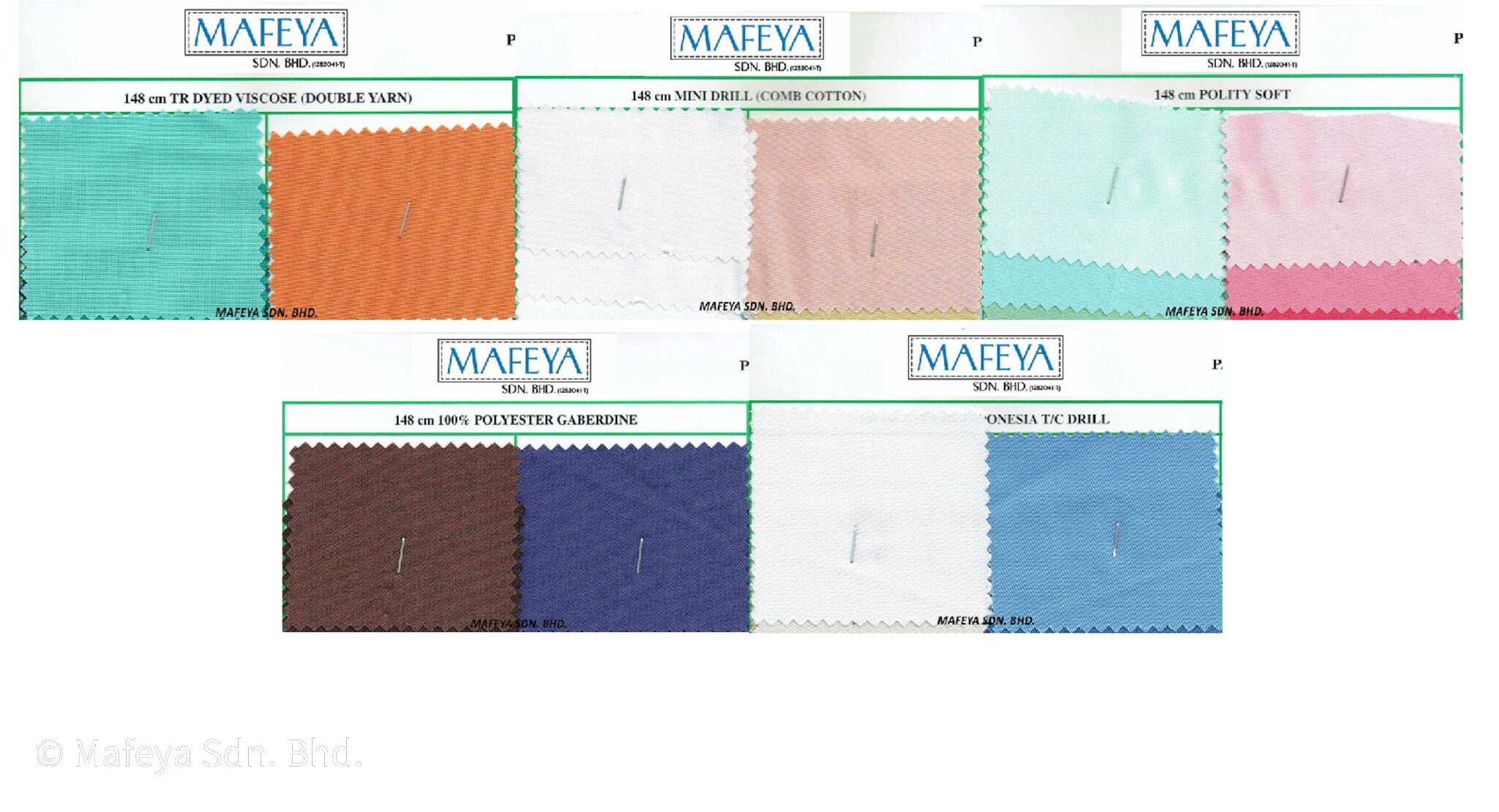 Antara fabrik yang sering digunakan termasuk Viscose (Double Yarn), Mini Drill (comb cotton), T/C Drill, Polyester Gaberdine dan Polity Soft. Pemilihan kain yang sesuai amat penting bergantung kepada jenis pekerjaan. Sebagai contoh, bagi kakitangan yang bertugas di lapangan, mereka memerlukan kain yang cepat kering dan tahan lasak bagi memastikan keselesaan sepanjang hari.