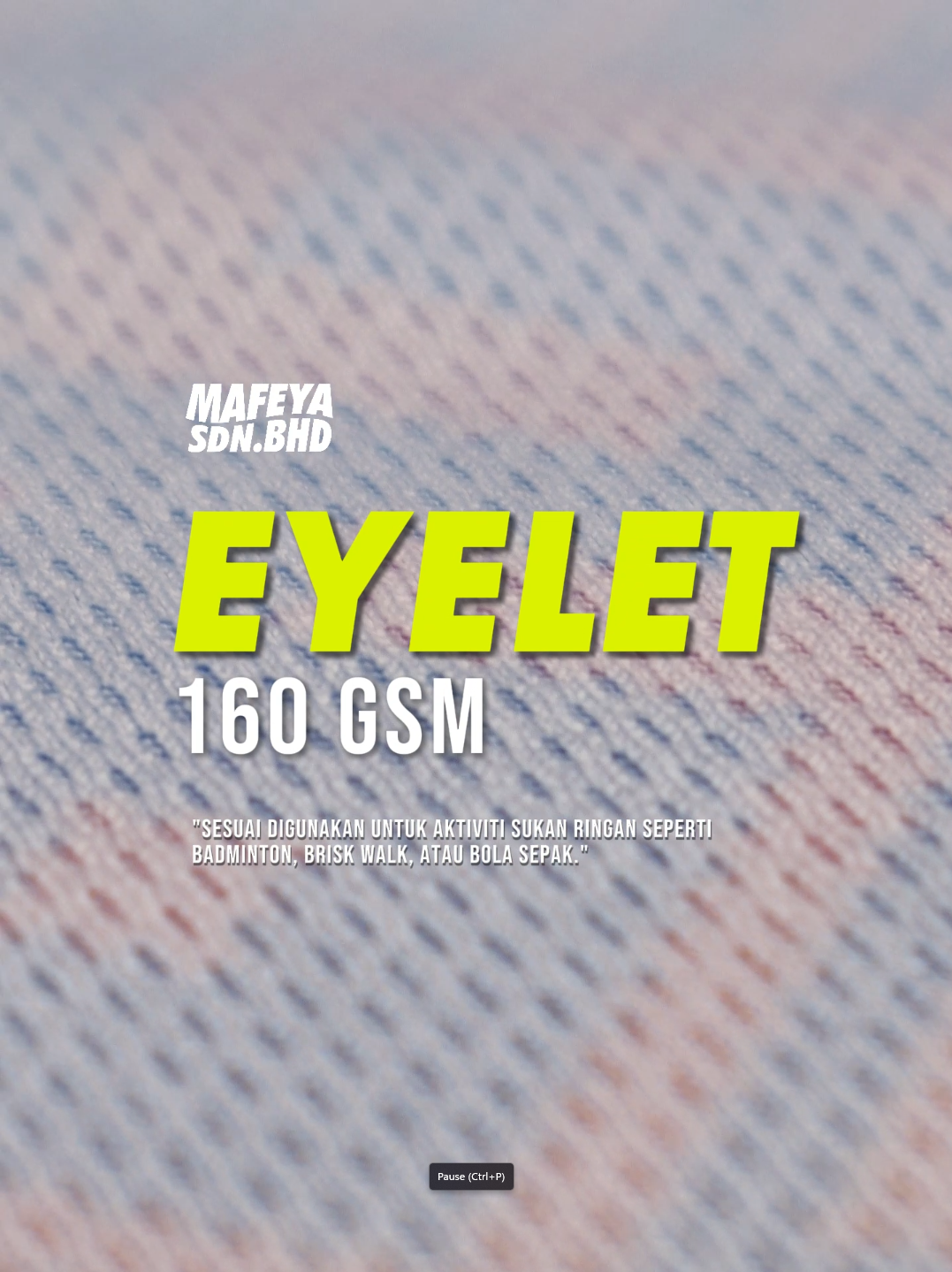 Microfiber Eyelet ialah kain ringan, cepat kering dan memiliki pengudaraan baik kerana struktur lubang kecilnya, menjadikannya sangat sesuai untuk pakaian sukan dan harian.