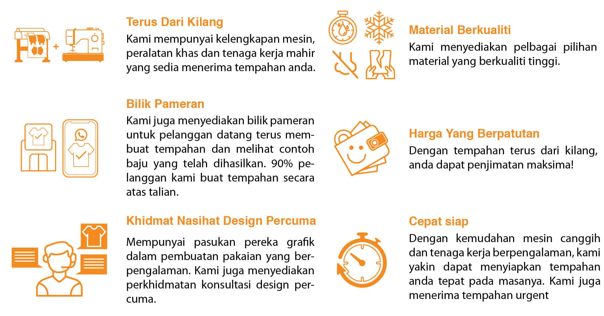 Dengan kemudahan mesin canggih dan tenaga kerja berpengalaman, kami yakin dapat menyiapkan tempahan anda tepat pada masanya. Kami juga menerima tempahan urgent